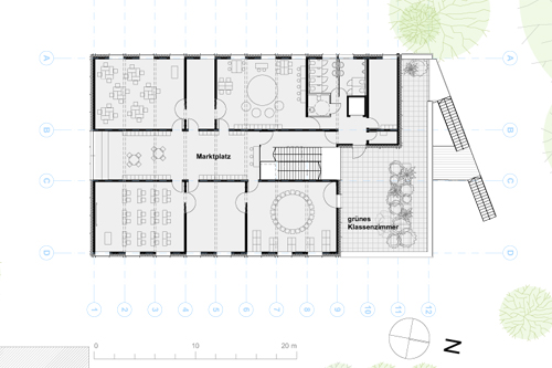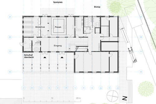 Dem Entwurf liegt ein durchgängiges Raster zugrunde, das auf die Transportmöglichkeiten von Holzbau-Modulen optimiert ist.