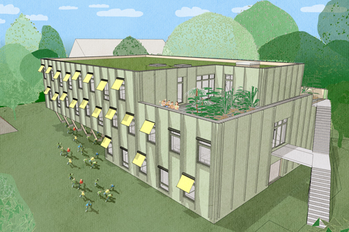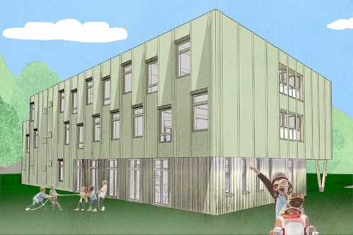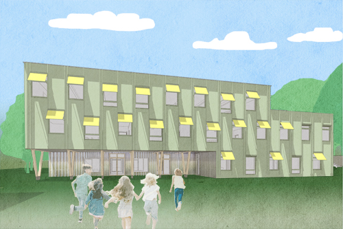 The design is based on a consistent grid optimized for the transport of prefabricated timber modules.